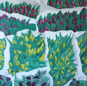 2021Morgens vroeg op de Utrechtse bloemenmarkt zie je de vele stalletjes met een diversiteit aan bloemen en planten. Een aantal bloemkwekers staan er met tulpen. Wat mij met name interesseert zijn de mooi ingepakte tulpen. Zie hier mijn kunstwerk van tulpen.